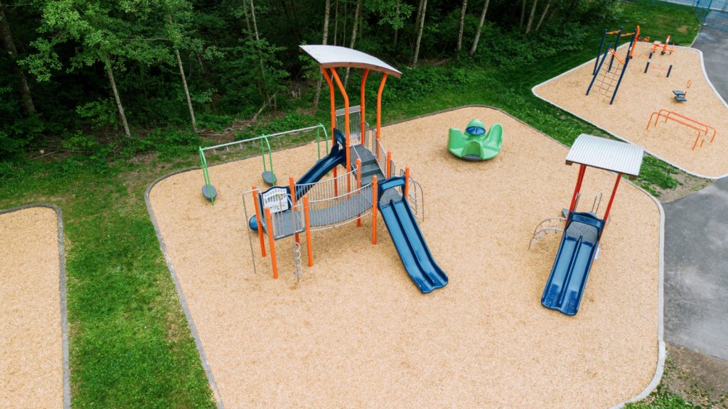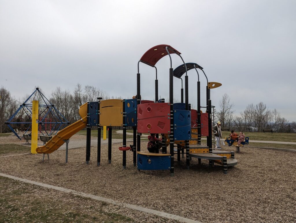The park’s designers made a remarkable choice: instead of erasing the landfill history, they embraced it. The archaeological sandbox invites children to discover the past literally underfoot. An art tower houses actual artifacts from the dump years, displayed alongside toys donated by students at the adjacent elementary school. A mosaic picnic table was designed by local high school art classes. The youth area, bike skills course, basketball court, disc swing, ball hockey — was shaped by direct input from neighbourhood teenagers.