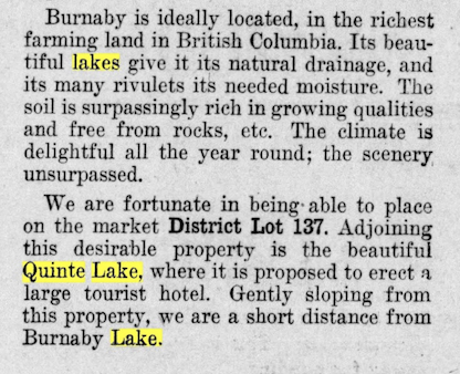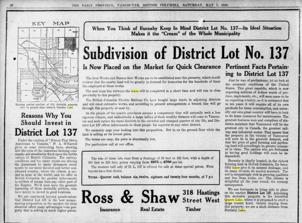 In 1910, Vancouver real estate firm Ross and Shaw placed an advertisement in the Daily Province for a new subdivision on the slopes of Burnaby Mountain. The ad promised buyers proximity to “the beautiful Quinte Lake, where it is proposed to erect a tourist hotel.” Residents of the old Lochdale district must have laughed out loud. The “lake” was a beaver pond in a marsh, so modest that locals joked you had to squint to see it. The grand name never caught on. The joke stuck forever.