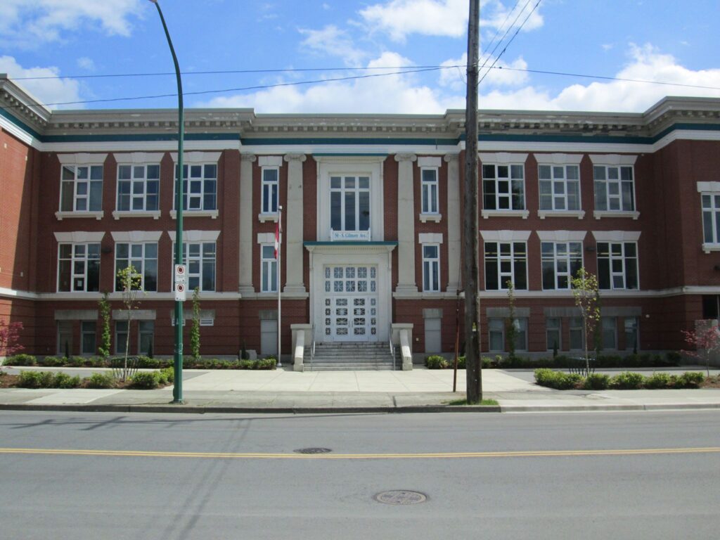 Gilmore Community School is easy to miss. It sits on a calm stretch of South Gilmore Avenue, set back from the street, half-hidden by trees and surrounded by lonely buildings. No landmark signs, no architectural drama, just a brick building from 1915 with a dentilled cornice and heavy wooden doors. The neighbourhood around it is unhurried, residential, the kind of place where you hear birdsong between the school bells. It takes a moment to register what you’re looking at: the only surviving brick school from that era in all of Burnaby. Over more than a century, this building has watched the world change while barely changing itself. It survived two world wars, the Great Depression, the Cold War, and the building boom that reshaped the city around it. Children from a squatter settlement on stilts once sat in its classrooms. So did the sons and daughters of railway workers, mill hands, and immigrants building new lives on cheap land.
