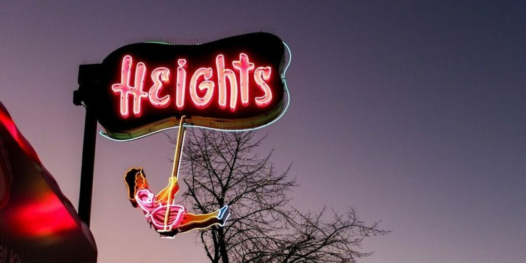 The most beloved survivor is the “Swinging Girl” sign at 4142 Hastings Street, created for Helen’s Children’s Wear in 1956 by Wallace Neon Company of Vancouver. Designer Reeve Lehman crafted the 9-foot-6-inch by 9-foot animated masterpiece featuring a cloud-shaped section reading “Helen’s” and an animated girl on a swing powered by internal motors and gears. It remains one of the best surviving examples of kinetic neon art in North America.