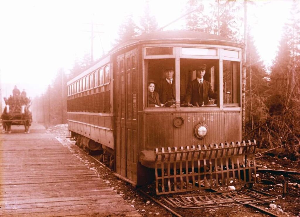 The Hastings Street Tramline Extension finally opened on December 22, 1913 (some sources cite December 23), running approximately 10,000 feet from Boundary Road to a terminus at Ellesmere Avenue. Joe Toffaletto headed the BCER construction team, and at the opening ceremony, Burnaby Reeve McGregor stood near the tram door while Councillor Eber Stride posed in front wearing a bowler hat. A surviving photograph shows uniformed men, a boy in his Sunday suit, and behind them, the planked wooden road that started it all.