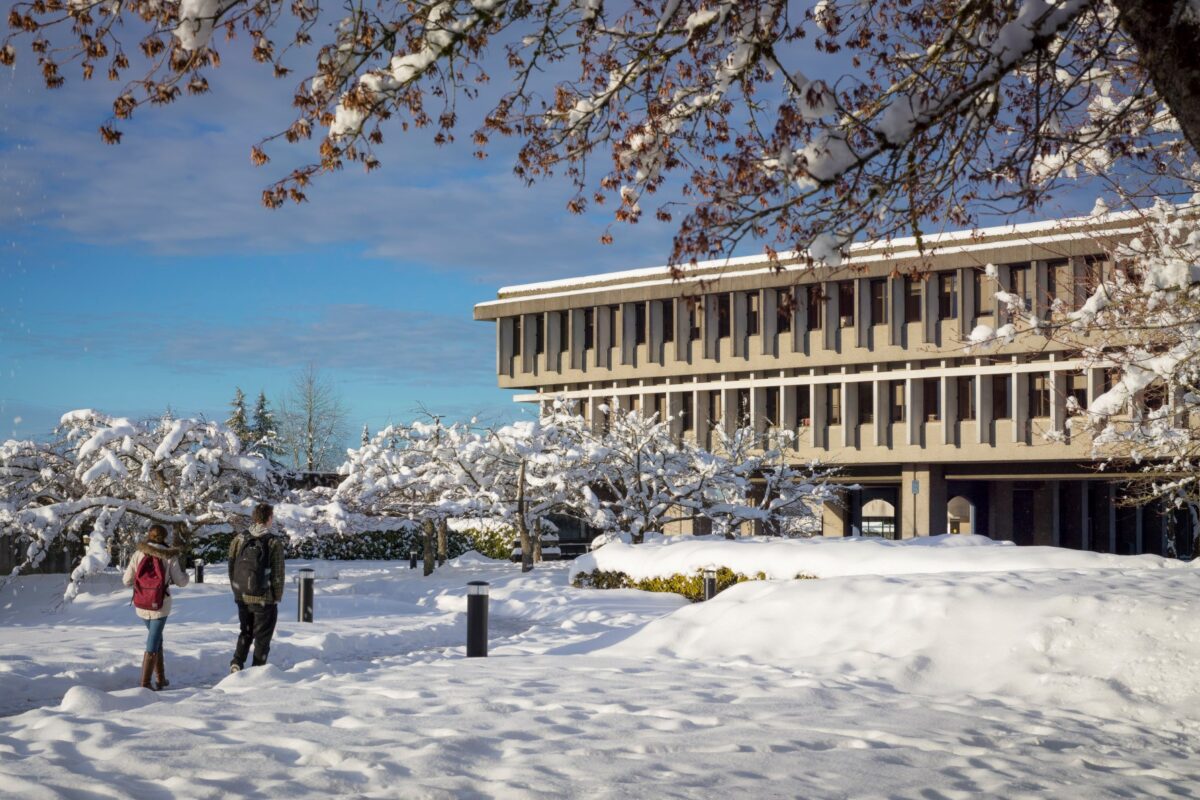 The campus has its own microclimate. Burnaby Mountain sits high enough that weather patterns differ from the city below. John Clague, SFU professor emeritus in Earth Sciences, explains: “In our temperate climate, our average winter temperatures are three to five degrees, but on Burnaby Mountain, temperatures could be zero or one. You can go from rain to snow really fast.” The mountain receives more than 50 centimetres of snow each year, mostly between December and March.