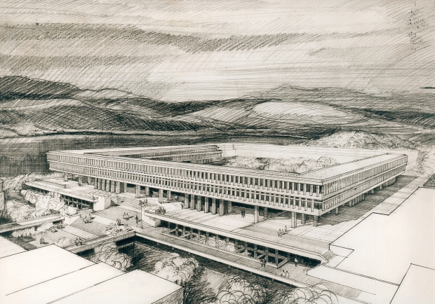 Erickson later described the design as a response to the site: “Building and mountain would appear to be part of each other.” In a separate interview, he acknowledged the climate directly: “The continuous covered walks between all parts of the university with the climate on the mountain here we felt was absolutely essential.”