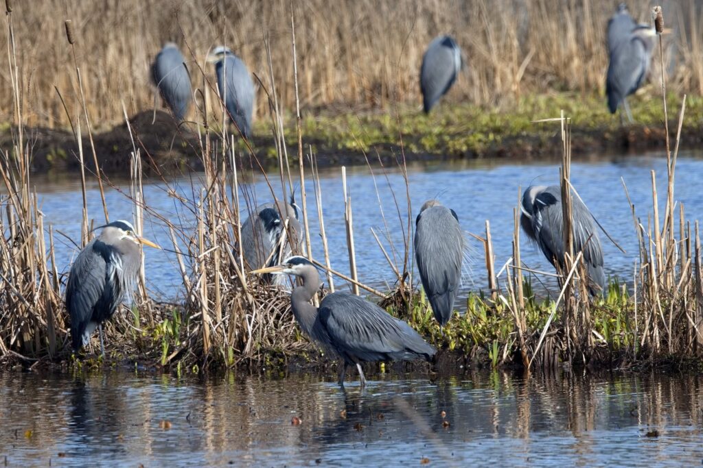 Great Blue Herons remain year-round, relying on the lake’s shallows even in colder months. The Pacific subspecies (Ardea herodias fannini) does not migrate and is listed as a Species of Special Concern due to loss of wetland habitat in the Georgia Basin. A large heronry at nearby Deer Lake — over 160 nests in recent counts — depends on foraging habitat at Burnaby Lake. The herons’ continued presence suggests that the wetland’s basic structure remains intact.